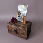 A mini altar for whatever space you have available. Works well on a mantel, a shelf, a desk, etc. Hardwood Mini-Altar includes slotted top which allows display of special objects with or without support. Use it to display your weekly oracle or tarot draw, a special fortune, a card from a friend. Mysterious Object is included to get you started for folks that "don't have anything special to display" it doesn't take much, any little thing can become an item of reverence and comfort. Mini-Altar includes drawer storage that can fit the display support, mysterious objects, and any small accoutrements one may collect. Make a weekly, monthly, or seasonal display!