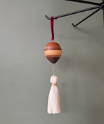 3" x 2.25" Mixed Hardwood Ornament with brass hardware and velvet ribbon with handmade cotton tassel